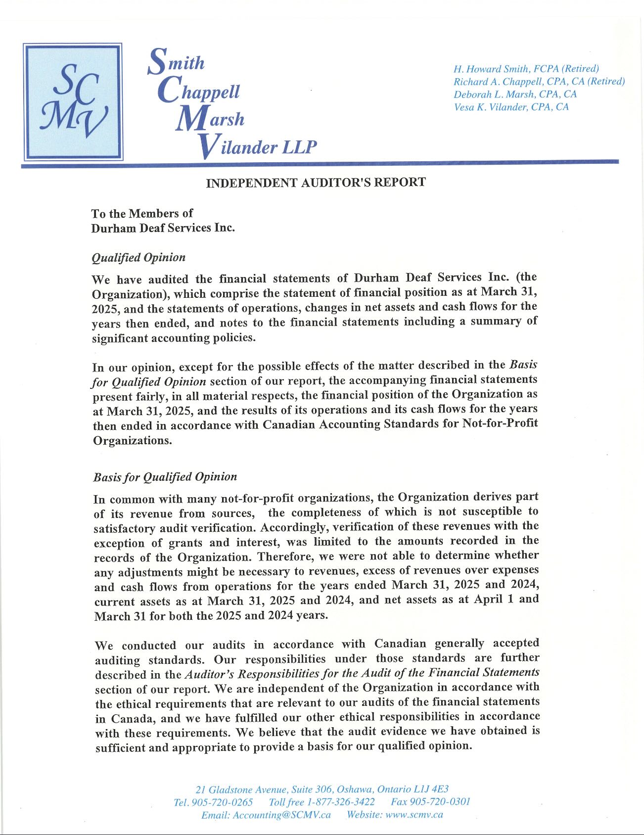 Annual Reports with Audited Financial Statements Audited Financial Statements 2024-25 Durham Deaf Services 900 King Street EastOshawa, Ontario L1H 1H2Phone: (905) 579-3328 Voice/TextFax: (905) 728-1183 Email: info@durhamdeaf.org Office Hours:Mon - Thurs8:30 - 4:30Fri - Sun: closed Name Phone Email Address Message 14 + 5 = Submit